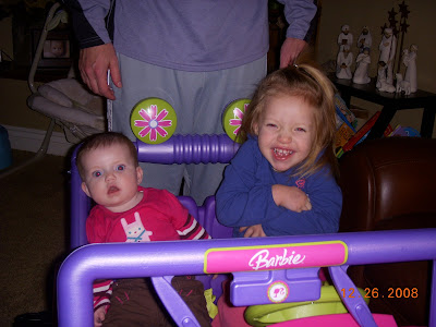 Addisen loved her Barbie Jeep from Santa! The picture with Elli and her in the Jeep is CLASSIC... look at Elli's face! She looks scared to death....
